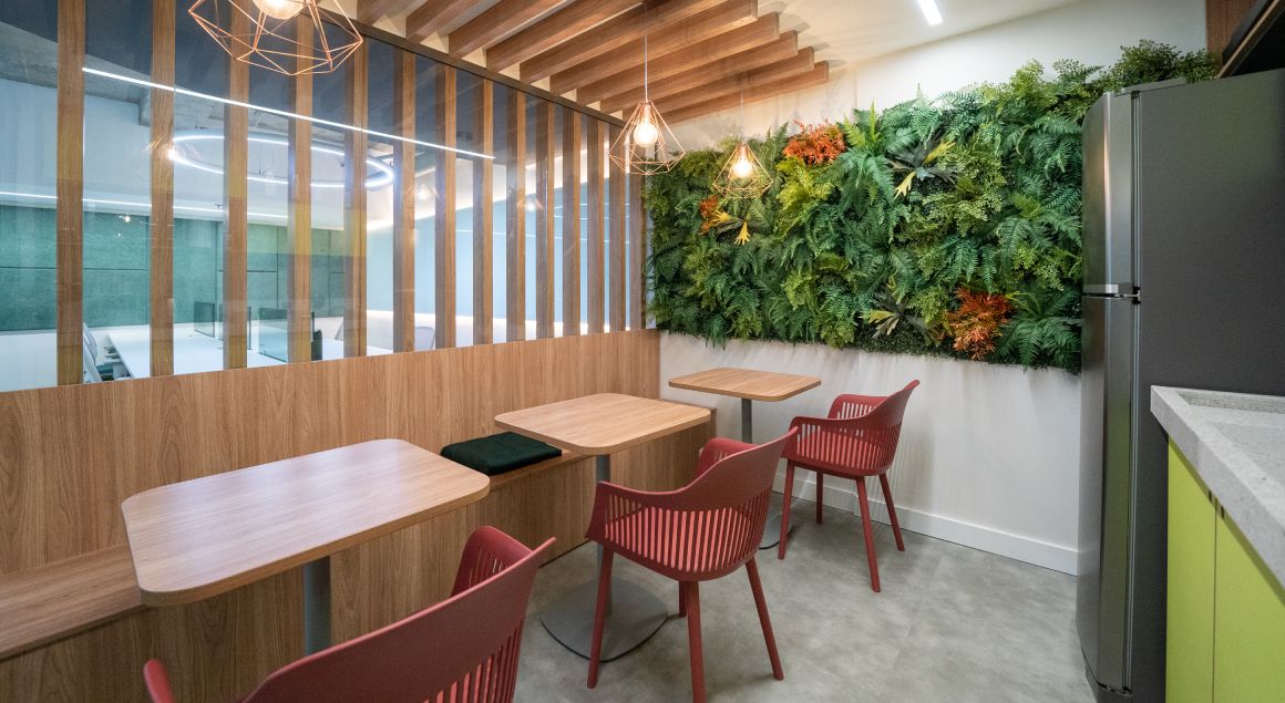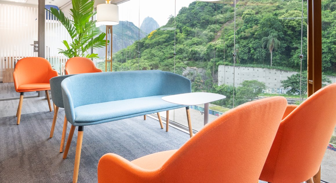 Uma característica que torna este resultado tão único são as escolhas para cada ambiente: estações de trabalho clean, com cadeiras ergonômicas, divisórias customizadas, biofilia e áreas de convivência e descompressão com mobiliário muito confortável e acolhedor.