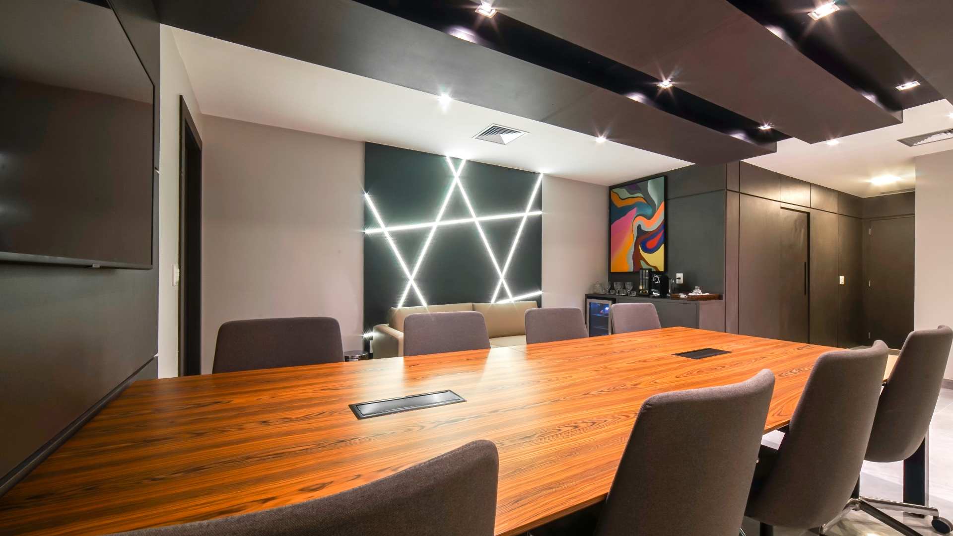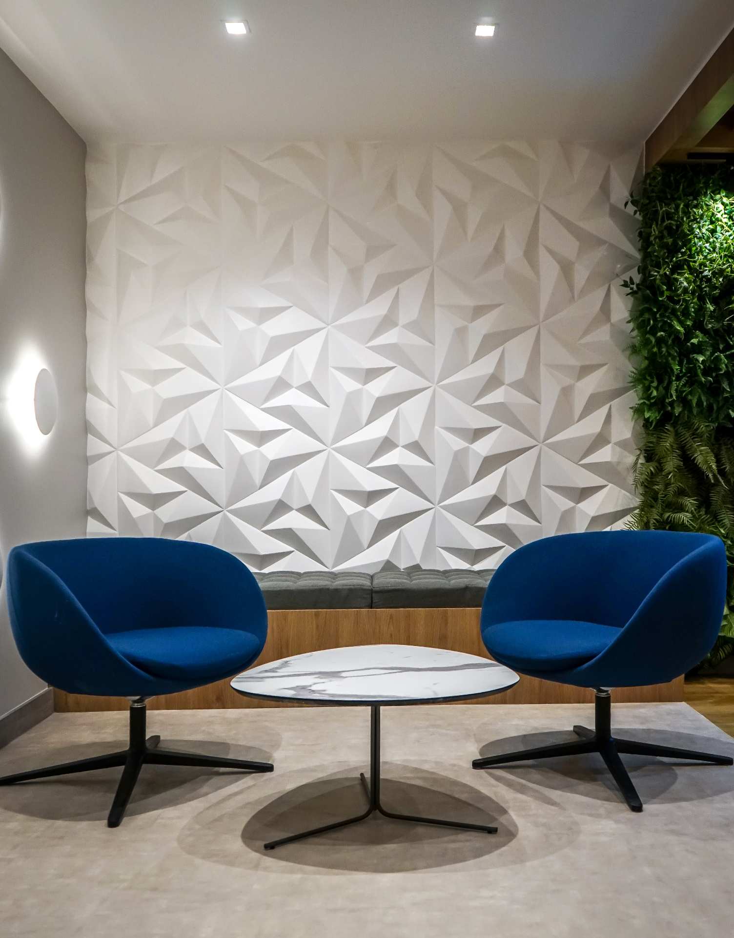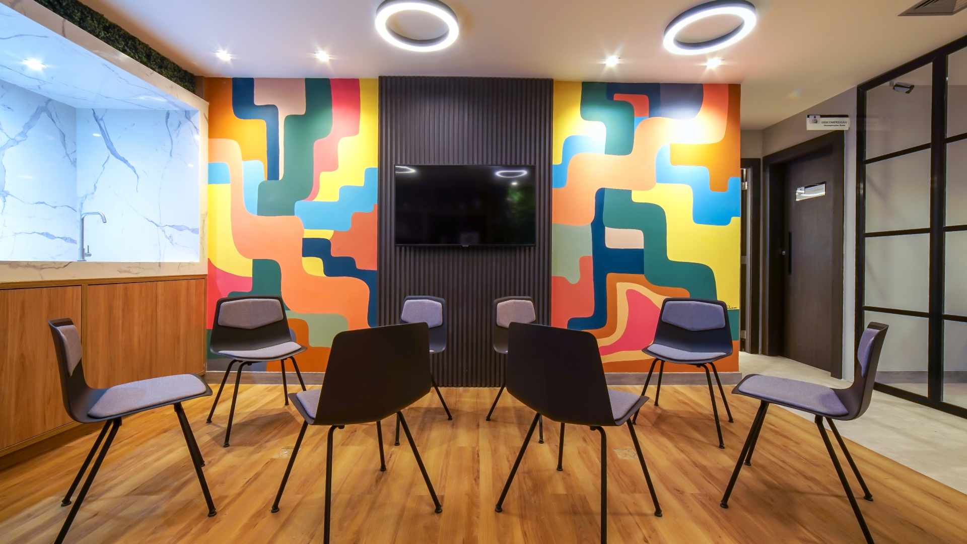 Project by architect Viviane Daher managed to give personality using the company’s colors in the waiting area and customer service, which has a TV, coffee space, bar and a vertical garden that creates a beautiful and relaxed atmosphere.